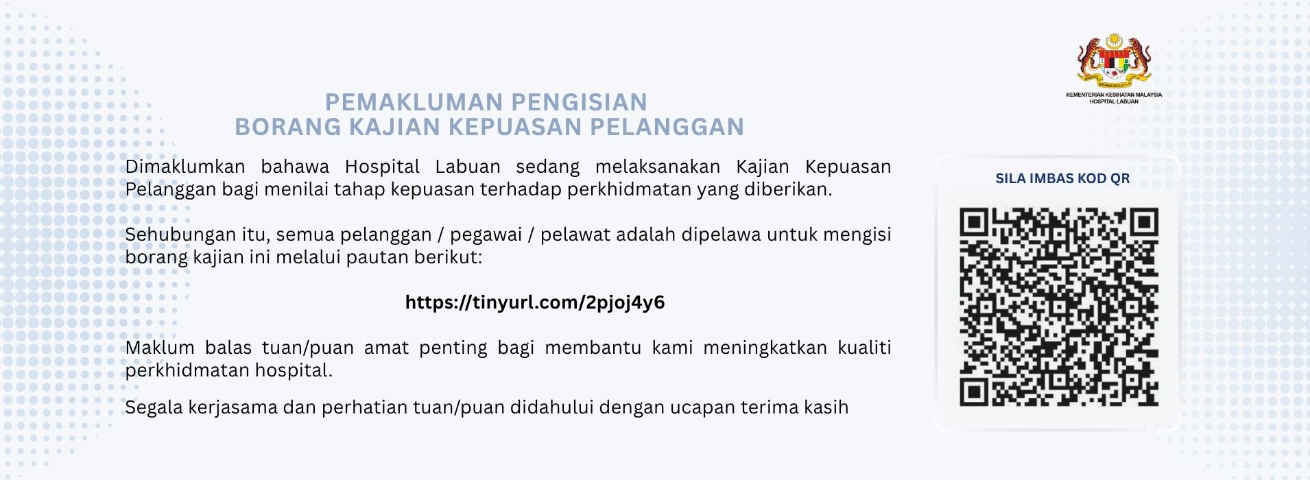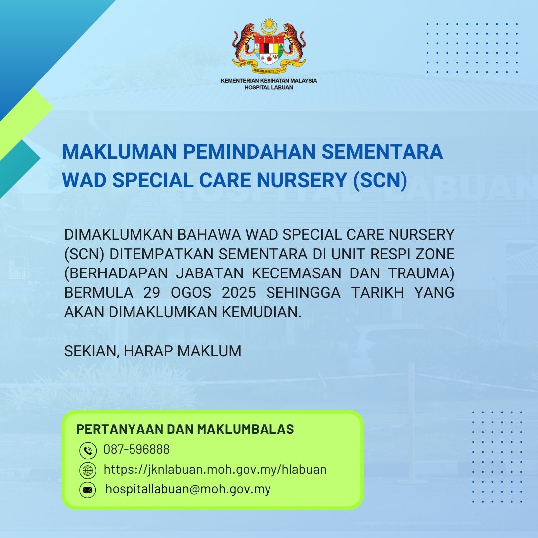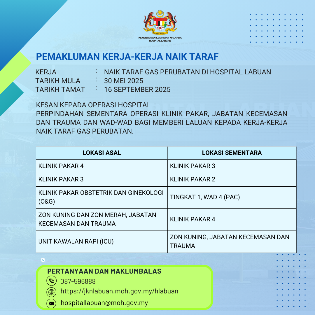 Klik di sini bagi paparan Senarai Perpindahan Sementara Lokasi Operasi Hospital Labuan bagi memberi laluan kepada kerja-kerja naik taraf di Hospital Labuan